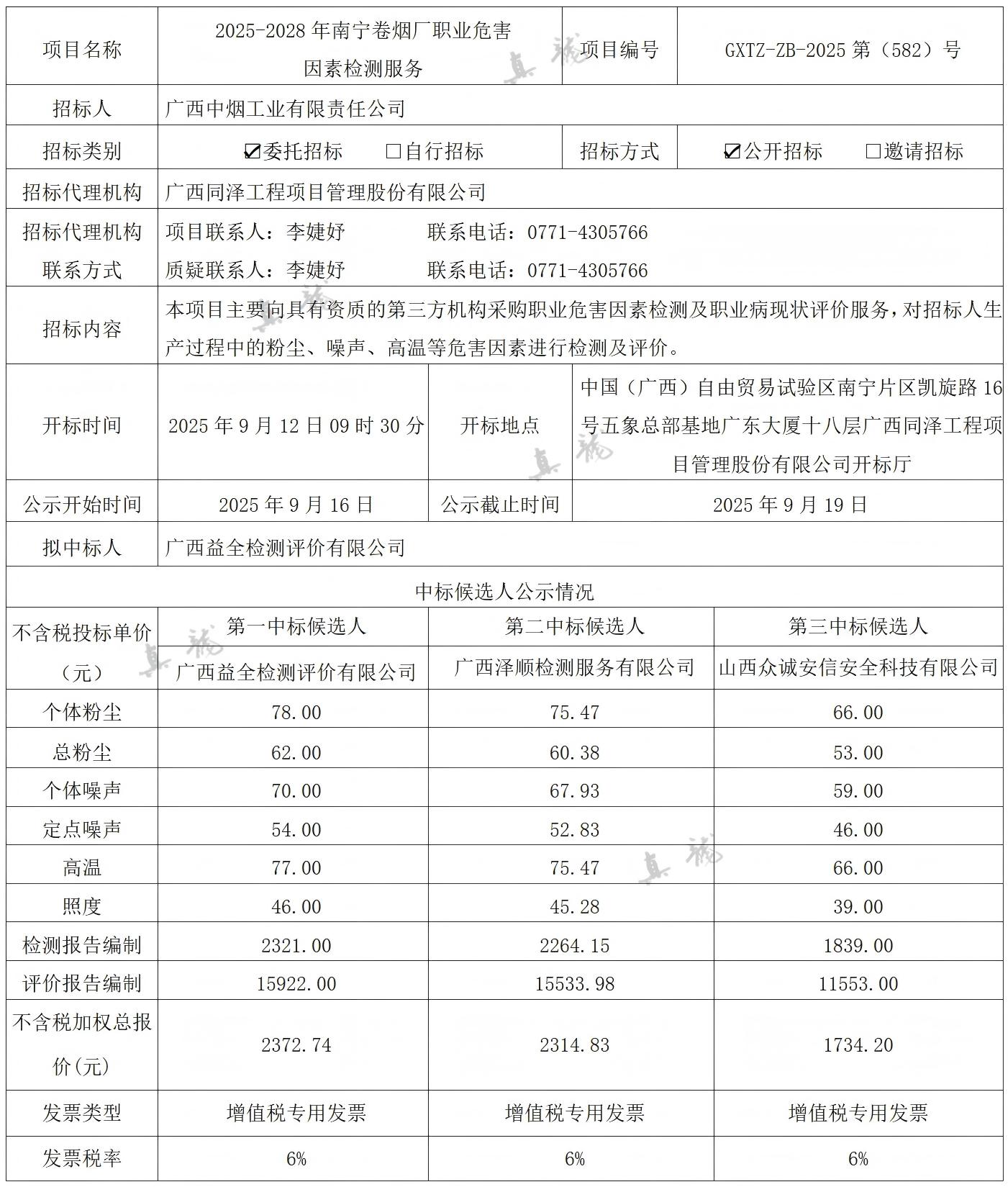 廣西中煙工業(yè)有限責任公司2025-2028年南寧卷煙廠職業(yè)危害因素檢測服務(項目編號:GXTZ-ZB-2025第(582)號)中標候選人公示